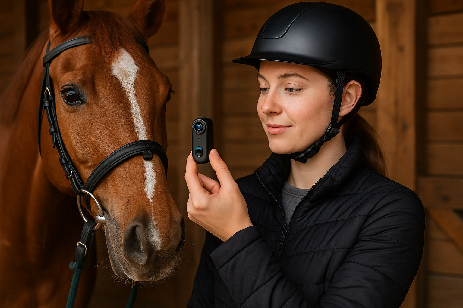 Kaum grĂ¶ĂŸer als dein Daumen – die Kamera fĂ€llt kaum auf, sieht aber stilvoll aus und passt perfekt zu deinem Reitoutfit.